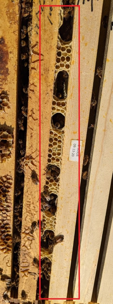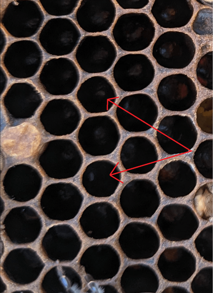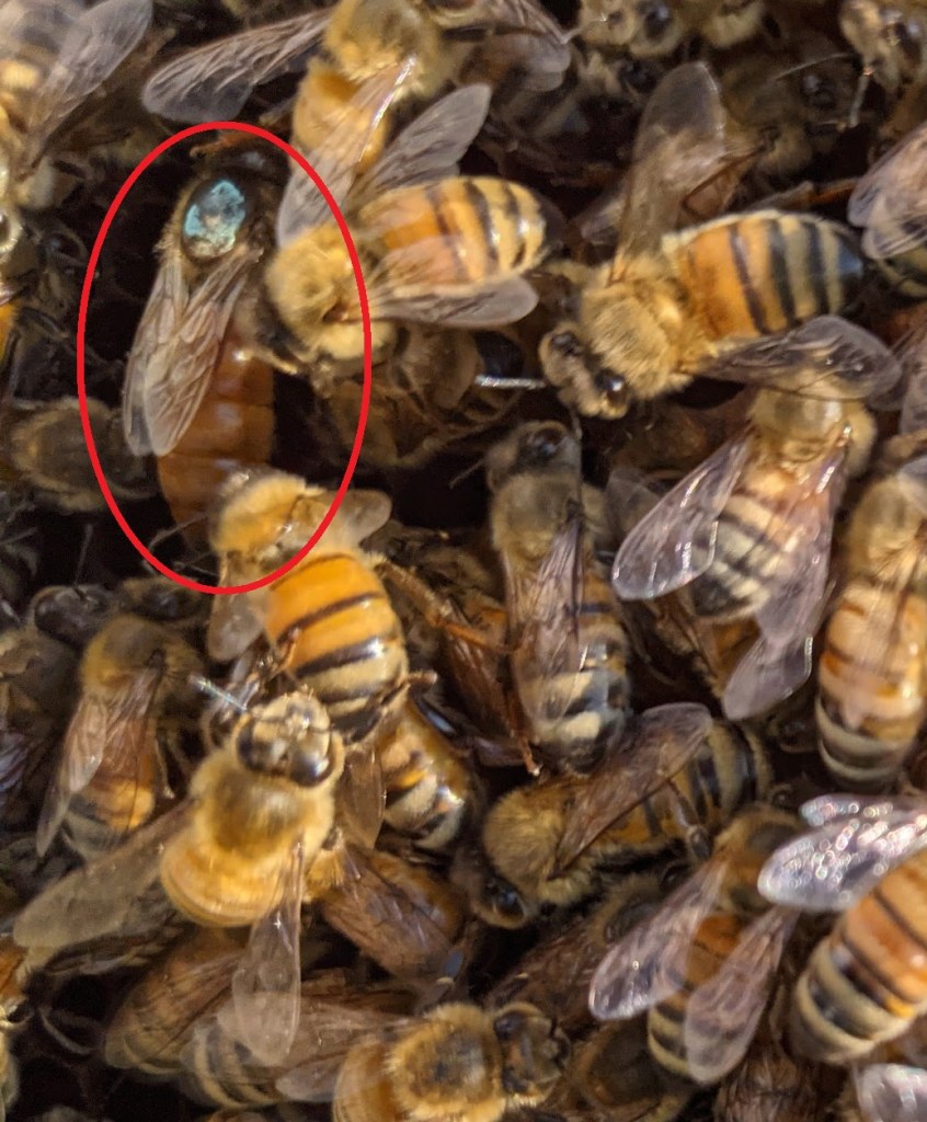 As I close this entry out, the final goal of the day was to get an eye on the queen. The person I bought the Nuc from was very kind, and marked the queen for me with a big blue dot. that makes finding her for a new bee keeper much easier.